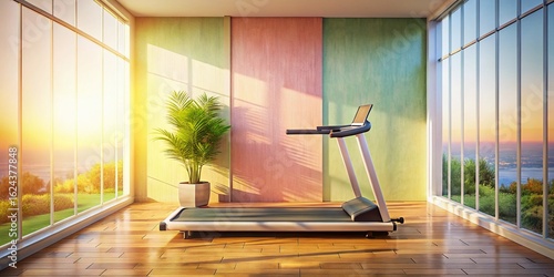 Obraz premium Minimalist Home Gym: Treadmill Workout Space, Soft Light, Wooden Floor
