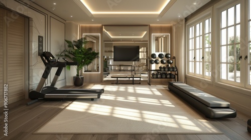 Fototapeta premium Minimalist home gym with sleek treadmill, wall-mounted weights, large mirror.