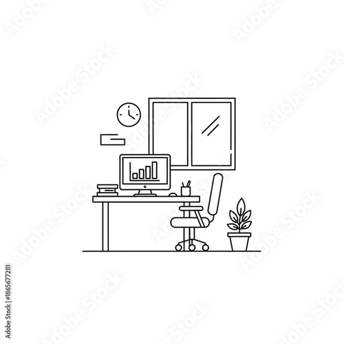 © Putri, Obraz premium Minimalist Home Office Desk with Computer and Potted Plant for Modern Workspace