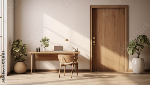 Fototapeta premium Minimalist Home Office Desk with Wooden Chair and Laptop