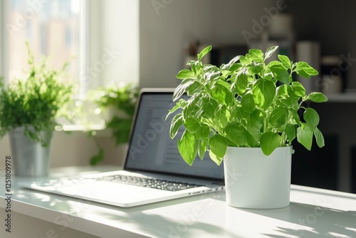 Fototapeta premium Minimalist Home Office with Laptop and Greenery – Eco-Conscious Workspace and...