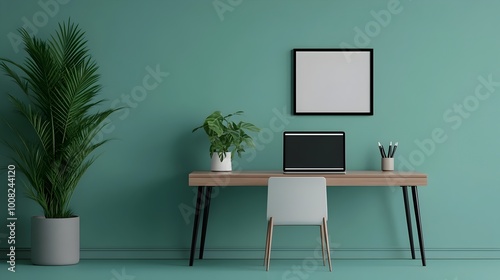 Fototapeta premium Minimalist Home Office with Laptop Tablet and Indoor Plants