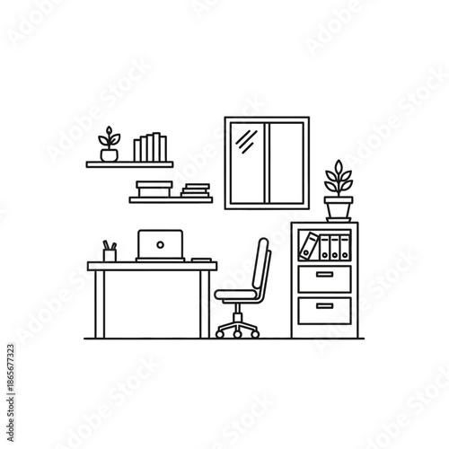 © Putri, Fototapeta premium Minimalist Home Office Workspace with Desk Chair and Shelves