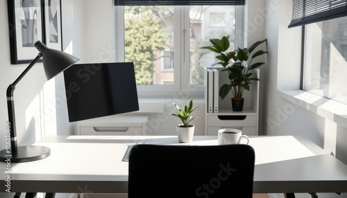© Narongsag, Fototapeta premium Minimalist Home Office Workspace with Sunlight and a Cup of Coffee.