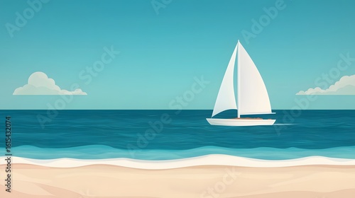 Obraz premium Minimalist illustration of a sailboat gliding on calm blue sea near a sandy...