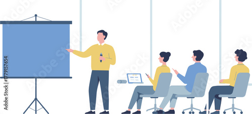 © Md Nayim islam, Obraz premium Minimalist illustration of business presentation scene with speaker, projector screen, and audience team in corporate meeting or training session