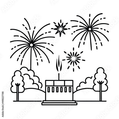 © Joy, Naklejka premium Minimalist Illustration Of Fireworks Over A Landmark Building Surrounded By Trees In Black And White Style