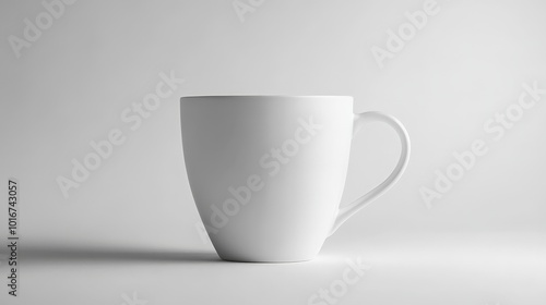 Obraz premium Minimalist image of a plain white coffee mug against a soft gray background,...