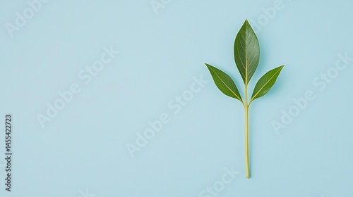 Fototapeta premium Minimalist image of three green leaves on a light blue background, arranged...