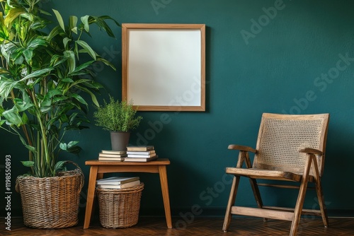 © Vooglo.com, Fototapeta premium Minimalist interior design blank picture frame on a teal wall wooden side table with books