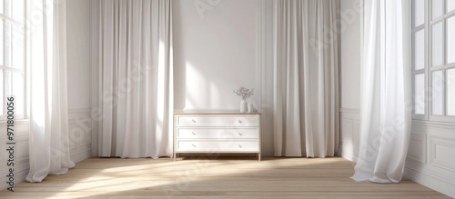 Obraz premium Minimalist interior design featuring a white empty room with a dresser on wooden flooring large wall decor and white views through curtained windows Nordic inspired background 3D illustration