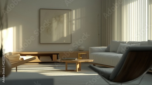 © vadosloginov, Fototapeta premium Minimalist interior design featuring clean white aesthetics and natural light in a cozy living space