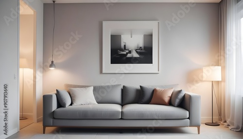 Fototapeta premium Minimalist interior design of a modern living room with a grey sofa near a...