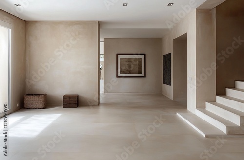 © BerkahStock, Fototapeta premium Minimalist interior design of a spacious hallway with beige walls, a wooden box, a wicker basket, large windows, and a staircase.