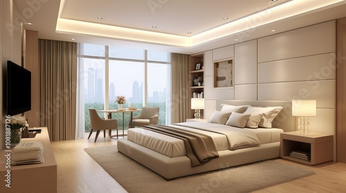 © Budi, Fototapeta premium Minimalist interior design of modern bedroom with beige stucco wall