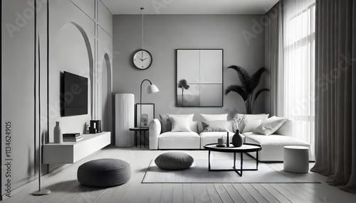Fototapeta premium Minimalist interior design showcases a gray and white living room with clean...