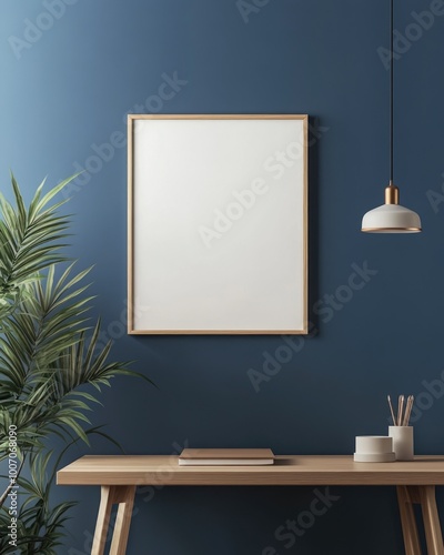 © Olena, Fototapeta premium Minimalist Interior Design with Dark Blue Wall and Modern Poster Frame Mockup