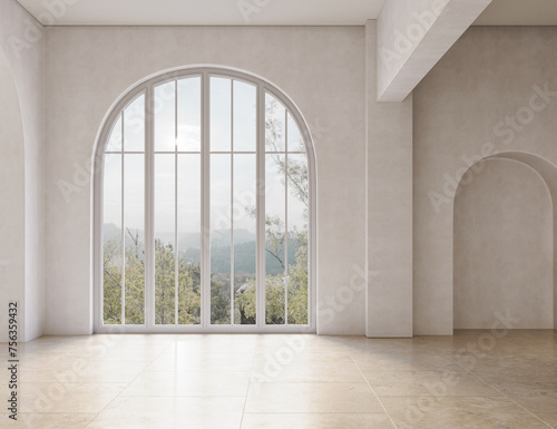 Obraz premium Minimalist interior design with large arch windows. Wall mockup concept, 3d...