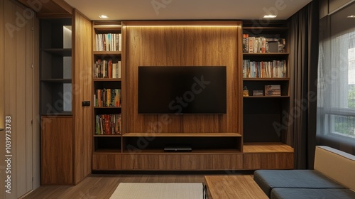 © Intach, Fototapeta premium Minimalist interior featuring a wooden wall unit with a wall-mounted TV and organized bookshelves
