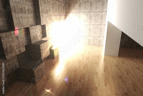 Fototapeta premium Minimalist interior is showing concrete cubes on wood floor with lens flare...