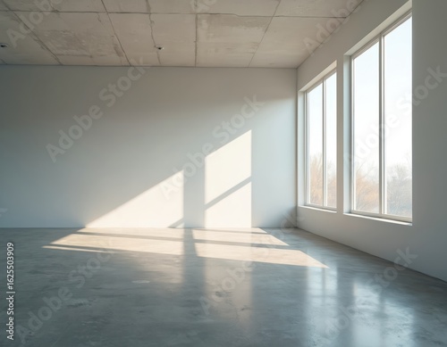 Fototapeta premium Minimalist interior room with bright natural light, concrete floor. Large...