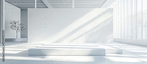 Obraz premium Minimalist interior space with large windows, empty white walls, and natural...