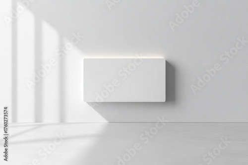© Margarita, Fototapeta premium Minimalist interior with a modern white rectangular panel mounted on a textured white wall casting soft shadow and light from window blinds