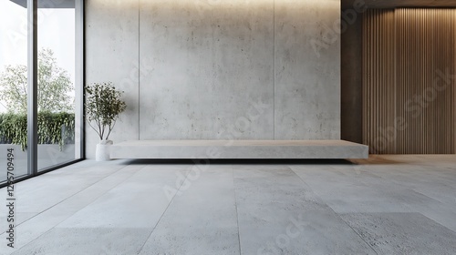 © Generative AI, Obraz premium Minimalist interior with concrete wall and sleek bench creating a serene modern space for relaxation : Generative AI