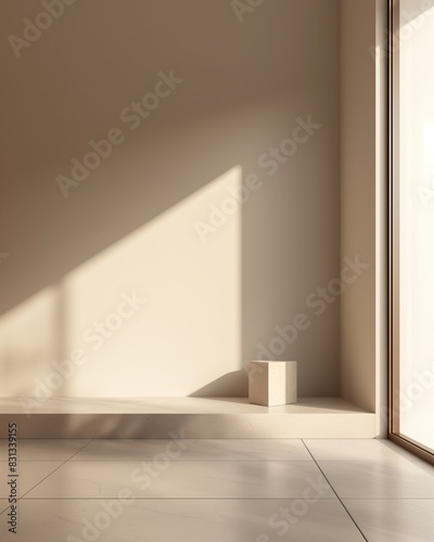 © Tirawat, Obraz premium Minimalist Interior with Sunlight Casting Geometric Shadows on Wall