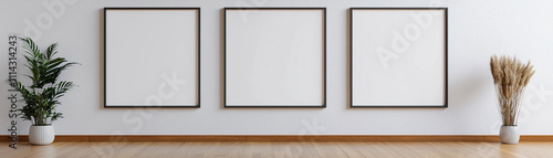 Fototapeta premium Minimalist interior with three blank frames, plants, and wooden floor, perfect for modern home decor and art display.
