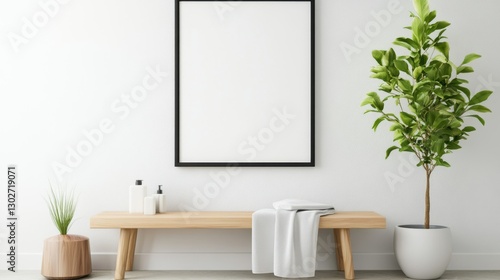 © Юлия Падина, Fototapeta premium Minimalist interior with wooden bench and greenery in modern living space