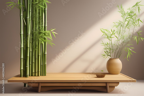 Obraz premium Minimalist Japanese room with bamboo and plant pot, Interior design