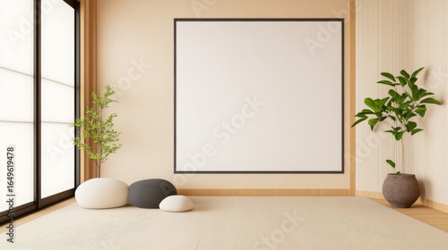 Fototapeta premium Minimalist Japanese Room with Blank Poster Frame and Plants, Interior ,Decor