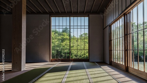 Obraz premium Minimalist Japanese-style room with large windows overlooking lush green trees
