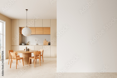 Fototapeta premium Minimalist kitchen and dining area with blank wall for design display. 3D...