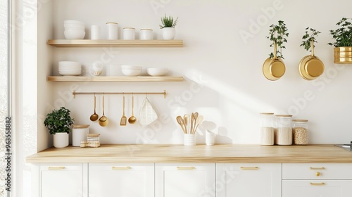 © matoya, Fototapeta premium Minimalist Kitchen with Wooden Shelves and Gold Accents