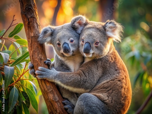 © Arnada, Fototapeta premium Minimalist Koala Couple Cuddling in Eucalyptus Tree - Romantic Wildlife Stock Photo