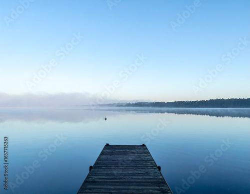 Fototapeta premium Minimalist Lake with Dock and Misty Morning Reflections