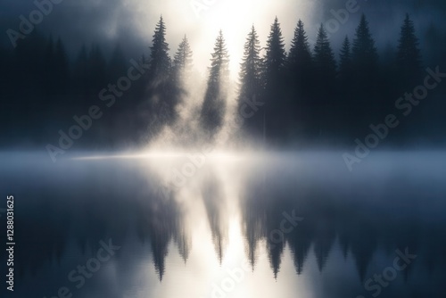 © julija, Fototapeta premium minimalist lakeside composition with quantum particles dancing across mirror-like water surface, ethereal morning mist, and silhouetted pine trees