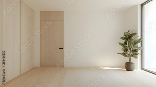 © KIMEHIME, Fototapeta premium Minimalist light room interior design, plant, sun