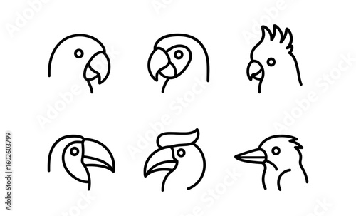 Fototapeta premium Minimalist line art bird heads collection: parrots, toucans, cockatoos