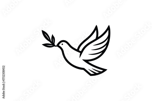 © raton, Fototapeta premium Minimalist line art of a dove flying upwards holding an olive branch