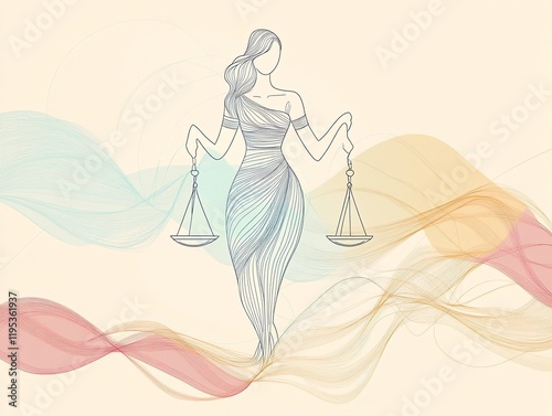 Obraz premium Minimalist line art of a woman holding scales of justice surrounded by pastel waves representing fairness and law