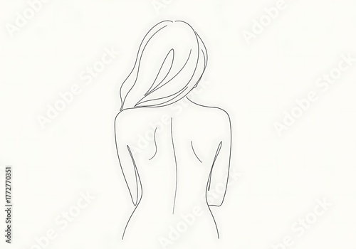 © Foysal, Fototapeta premium Minimalist line art of a womans back and hair, isolated on white background