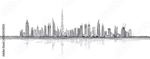 © shah, Naklejka premium Minimalist line art skyline of Dubai, continuous single line drawing iconic landmarks.