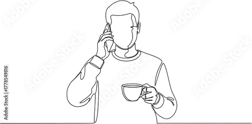 Fototapeta premium Minimalist line drawing of a man talking on a phone while holding a cup of coffee call drinking hand device communication