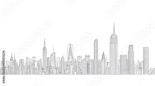 Naklejka premium Minimalist Line Drawing of Cityscape with Skyscrapers and Buildings Against White Background