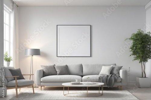 Fototapeta premium Minimalist living room interior design with grey sofa coffee table and floor lamp white backdrop with blank framed canvas