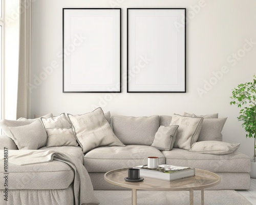 © PERFECTisME, Fototapeta premium Minimalist living room interior with a beige sectional sofa. two framed mockups. a coffee table. and a potted plant