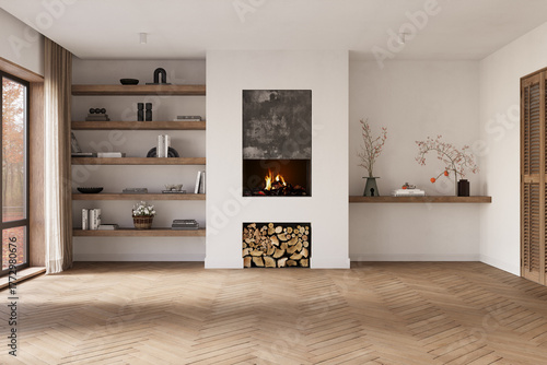 Fototapeta premium Minimalist living room interior with modern fireplace and white walls....